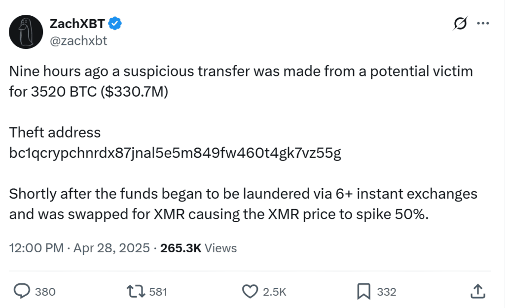 Kripto para dünyası, ünlü zincir üstü dedektif ZachXBT’nin ortaya çıkardığı devasa bir hırsızlık skandalıyla çalkalanıyor. 28 Nisan 2025 tarihinde tespit edilen olayda, 3,520 Bitcoin (BTC), yani yaklaşık $330.7 milyon değerinde bir fon, bilinmeyen bir cüzdandan bc1qcry…vz55g adresine transfer edildi. Bu şüpheli hareket, kripto topluluğunda büyük yankı uyandırırken, çalınan fonların hızla Monero (XMR)’ya çevrilmesi, XMR fiyatlarında %50’lik bir sıçramaya neden oldu.