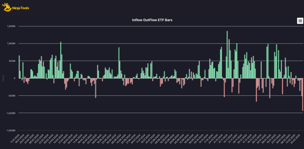 ABD’deki spot Bitcoin ETF’lerinden 25 Şubat’ta 937,9 milyon dolarlık net çıkış yaşandı. Bu, bugüne kadar kaydedilen en büyük günlük çıkış olarak kayıtlara geçti.