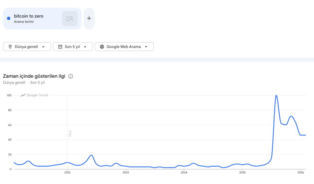 2026 yılı Bitcoin piyasasında dikkat çeken bir sinyal ortaya çıktı: ABD’de Google’da “Bitcoin sıfıra düşer mi / Bitcoin going to zero” gibi karamsar aramalar, ölçümlerin başladığı dönemden bu yana en yüksek seviyeye ulaştı. Ancak bu “korku endeksi”, fiyatın artık dip yaptığına kesin işaret etmiyor.