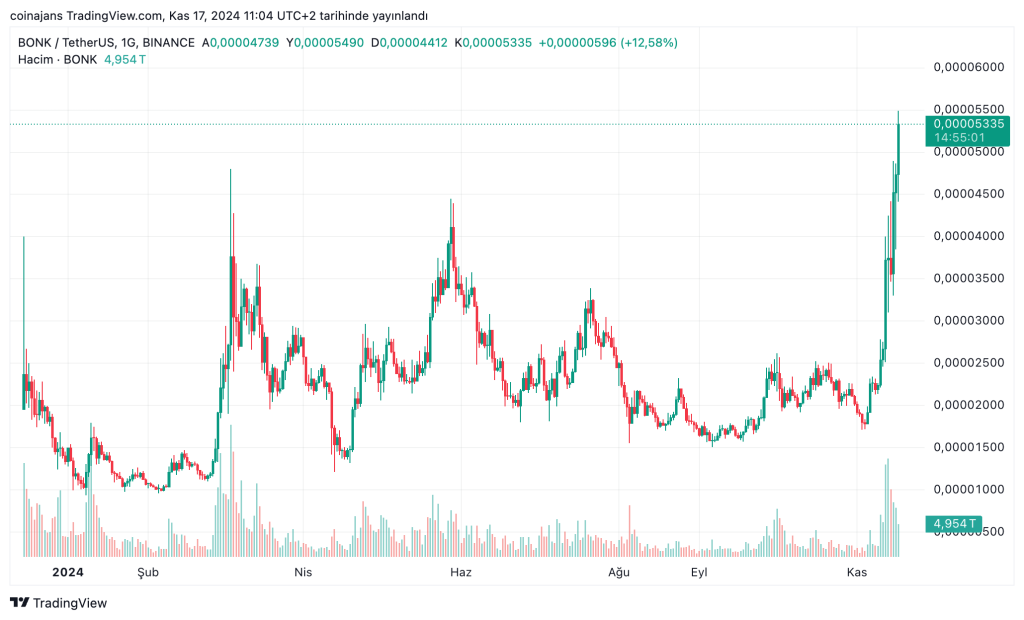 Solana ekosistemine dayanan memecoin BONK, son 24 saatteki %16’lık artışıyla kripto para piyasasında dikkatleri üzerine çekti. Coinbase gibi büyük borsalarda yüksek işlem hacmi ve topluluk desteğiyle yükseliş trendini sürdüren BONK, yatırımcılar tarafından potansiyel büyüme için umut vadeden bir proje olarak görülüyor.