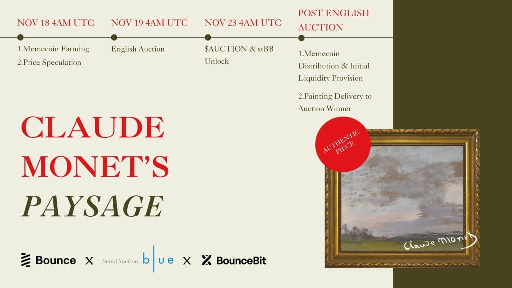 Sanat dünyasında heyecan verici bir gelişme yaşanıyor. Claude Monet’nin “Paysage” adlı eseri, 19 Kasım 2024’te başlayacak bir müzayede ile açık artırmaya sunuluyor. Bu özel etkinlik, blockchain tabanlı bir platform olan Bounce Finance üzerinden gerçekleştirilecek ve sanat ile dijital teknolojiyi bir araya getiren yenilikçi bir deneyim sunacak.