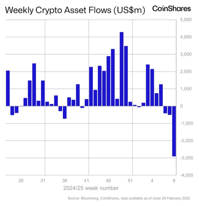 Kripto yatırım fonları, geçen hafta toplamda 2.9 milyar dolarlık rekor net çıkış gördü. CoinShares verilerine göre, bu negatif akışın arkasında Bybit saldırısı, ABD Merkez Bankası’nın şahin politikaları ve zayıflayan piyasa duyarlılığı gibi faktörler bulunuyor.