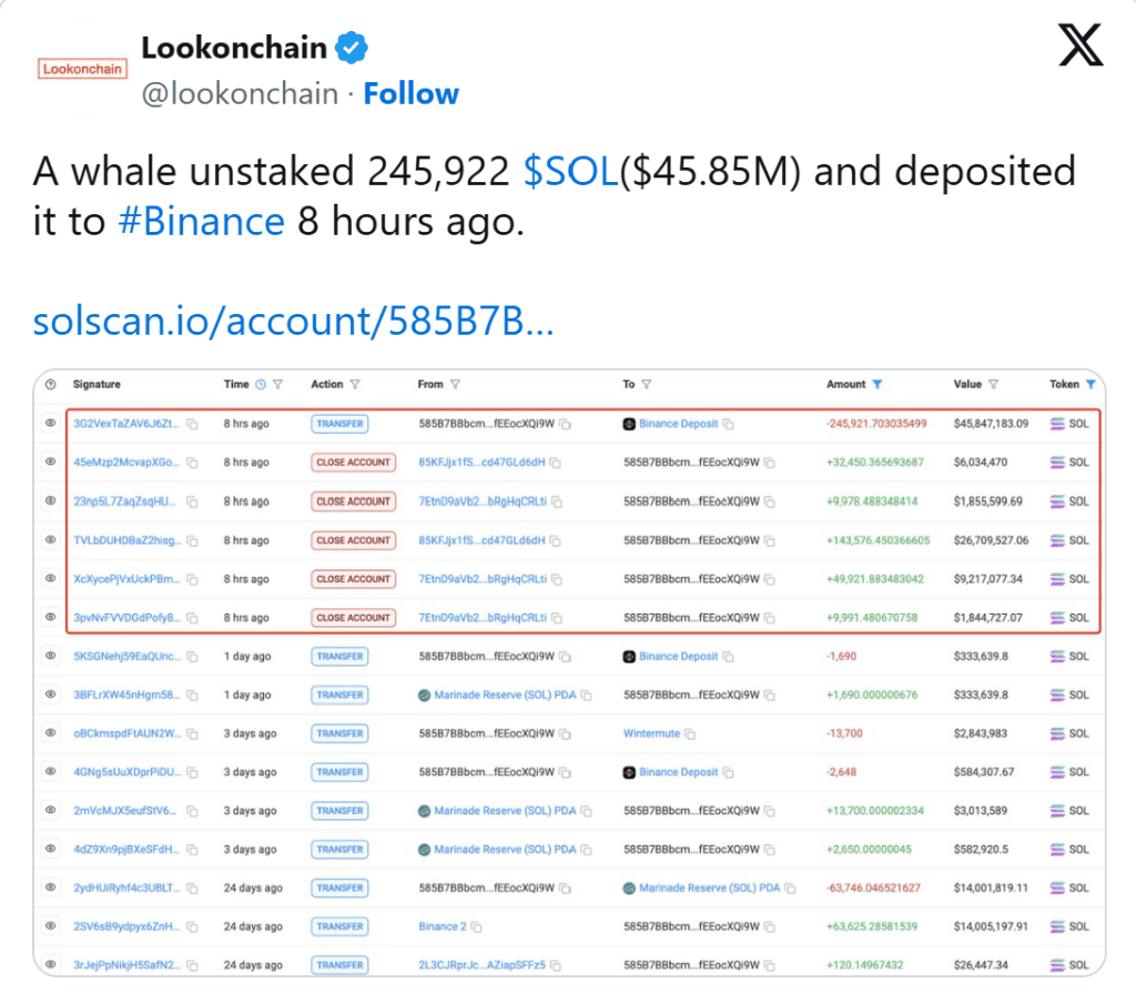 Solana (SOL) ekosisteminde dikkat çeken bir gelişme yaşandı. Büyük bir SOL yatırımcısı, yaklaşık 245,922 SOL tokenını (~$45.85 milyon) Binance’e taşıdı. Bu transfer, toplulukta satış hazırlığı yapıldığına dair söylentilere yol açtı.