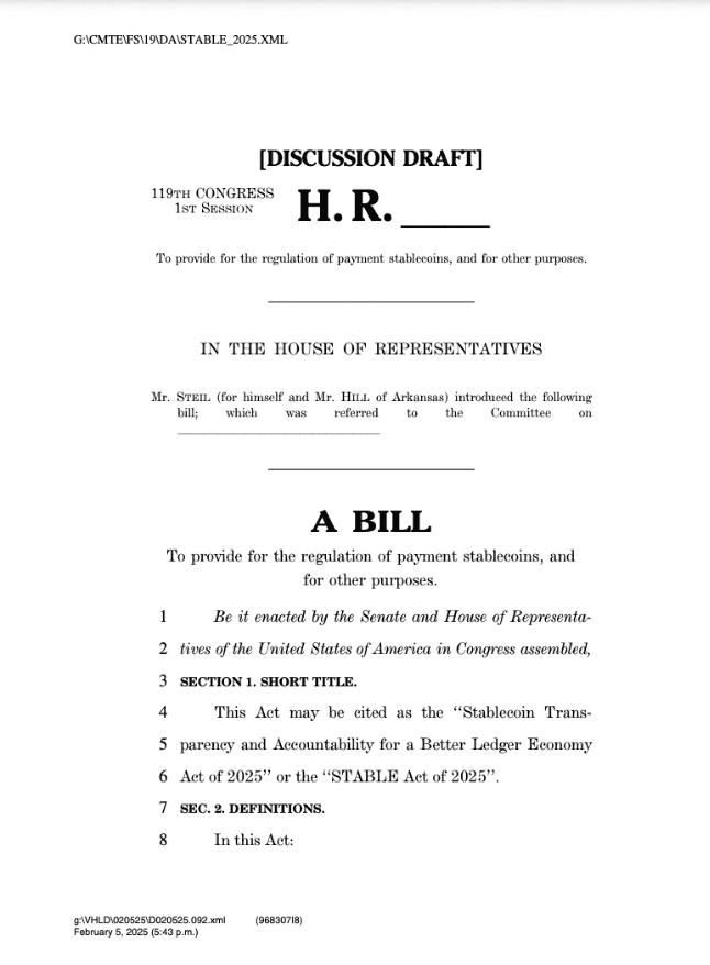 CoinMarketCap verilerine göre, 142 milyar dolarlık piyasa değeri ile en büyük stablecoin ihraççısı konumunda olan Tether, ABD Temsilciler Meclisi Finansal Hizmetler Komitesi Dijital Varlıklar Alt Komitesi Başkanı Bryan Steil ve Kongre üyesi French Hill tarafından 6 Şubat’ta sunulan STABLE Act üzerine çalışıyor.